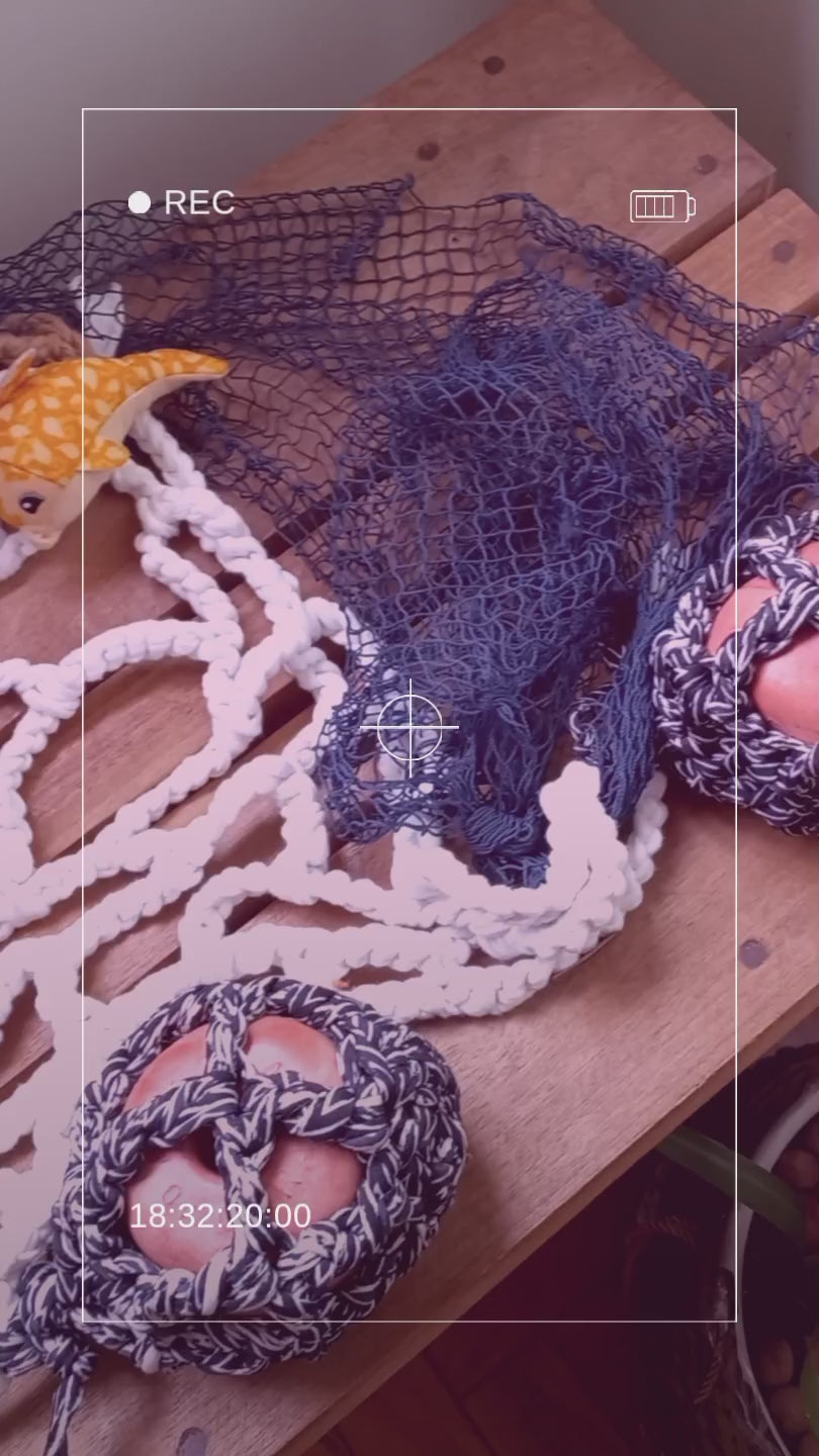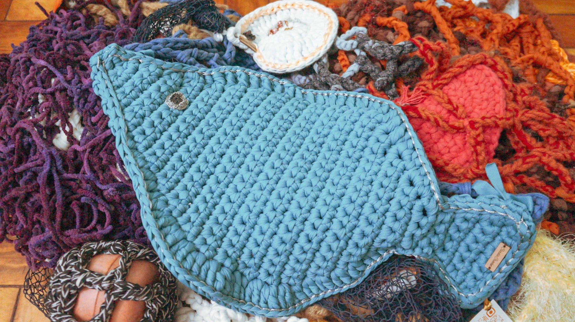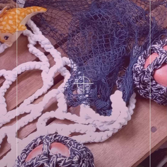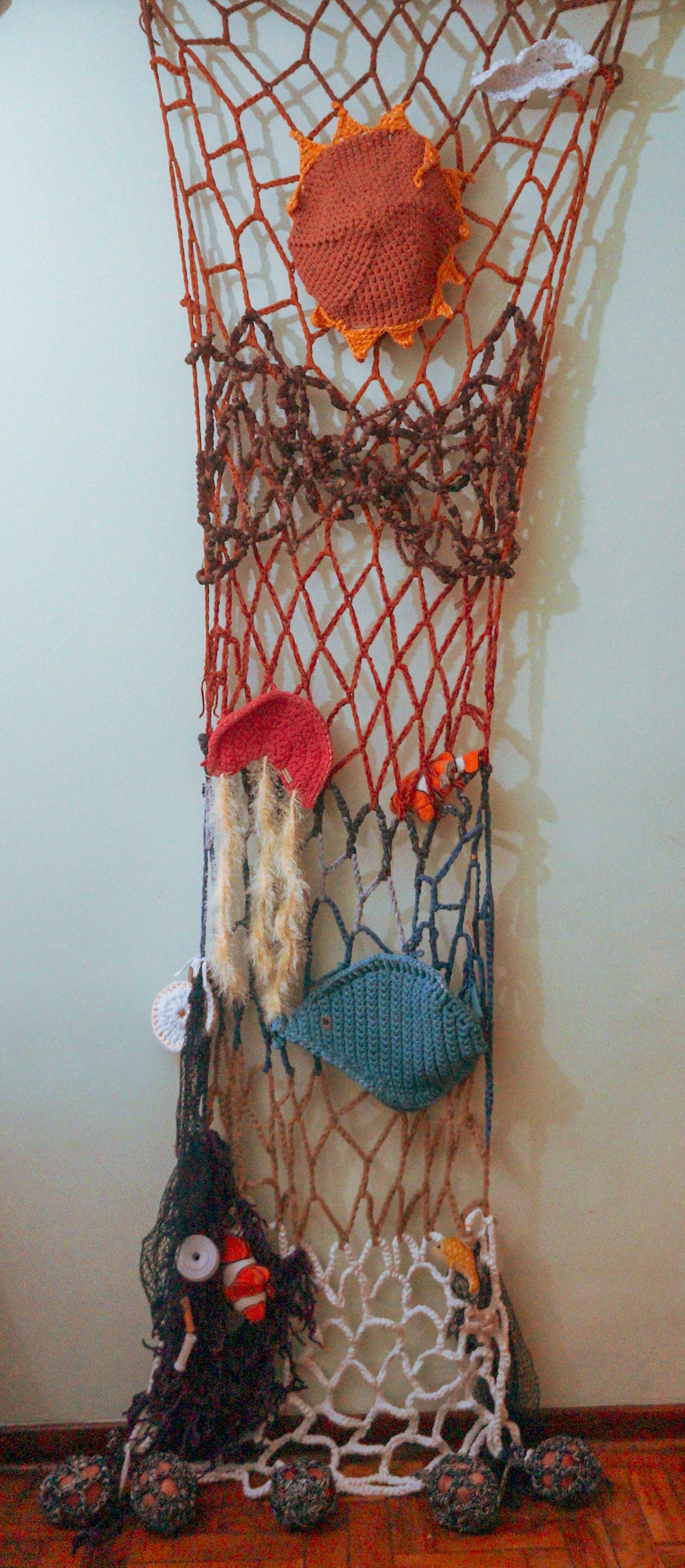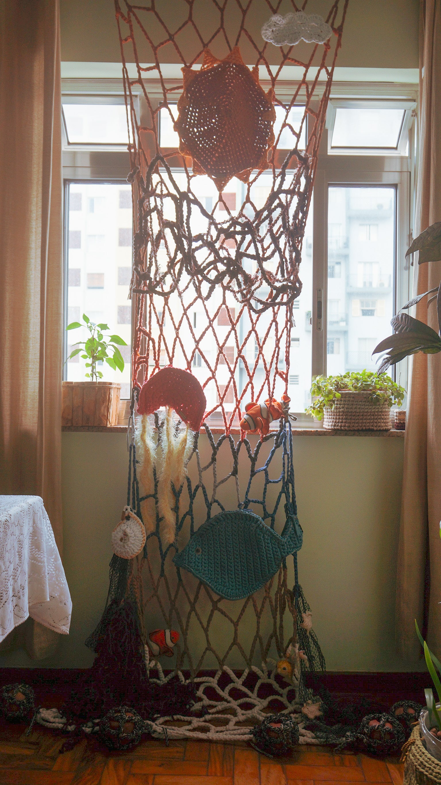 Essa versão da rede de pesca decorativa em crochê é a segunda versão um pouco menor da peça original de criação autoral, medindo 2.5 metros de altura X 1.5 metro. Toda em crochê com fio de malha entre outros materiais de reaproveitamento como retalhos e cortiças de redes de pesca já utilizadas.