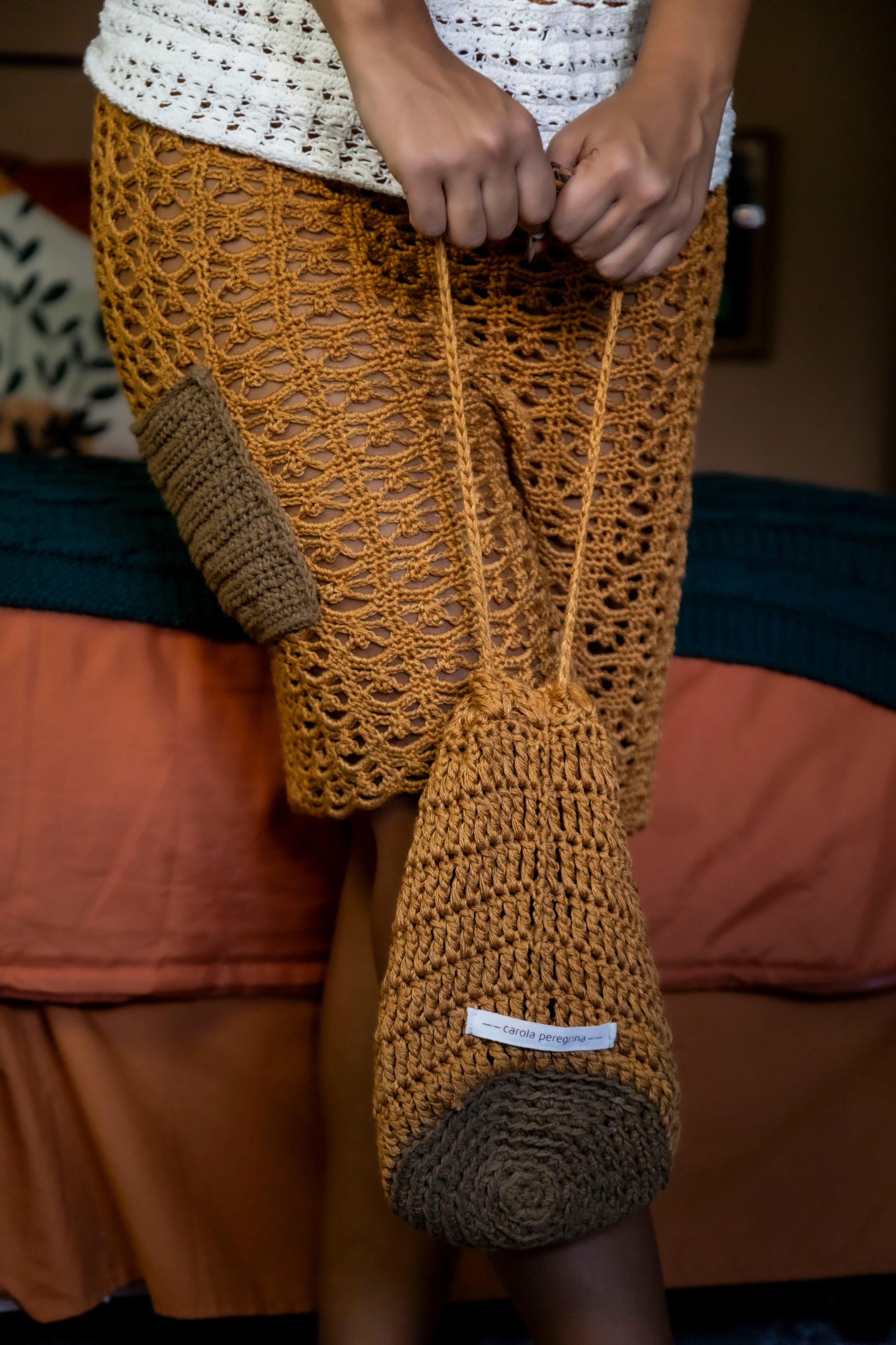 Crochê em viscose de cana de açúcar com bolso em algodão reciclado. Com amarração e elástico na cintura, peça única veste tamanhos Me e Gr