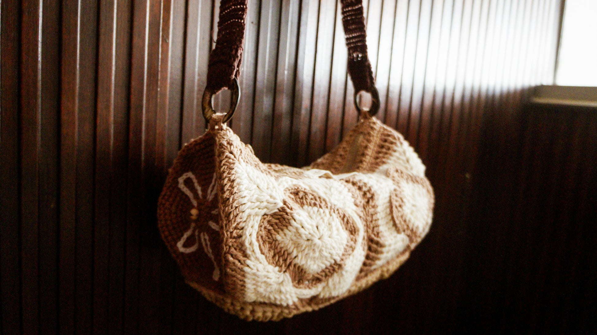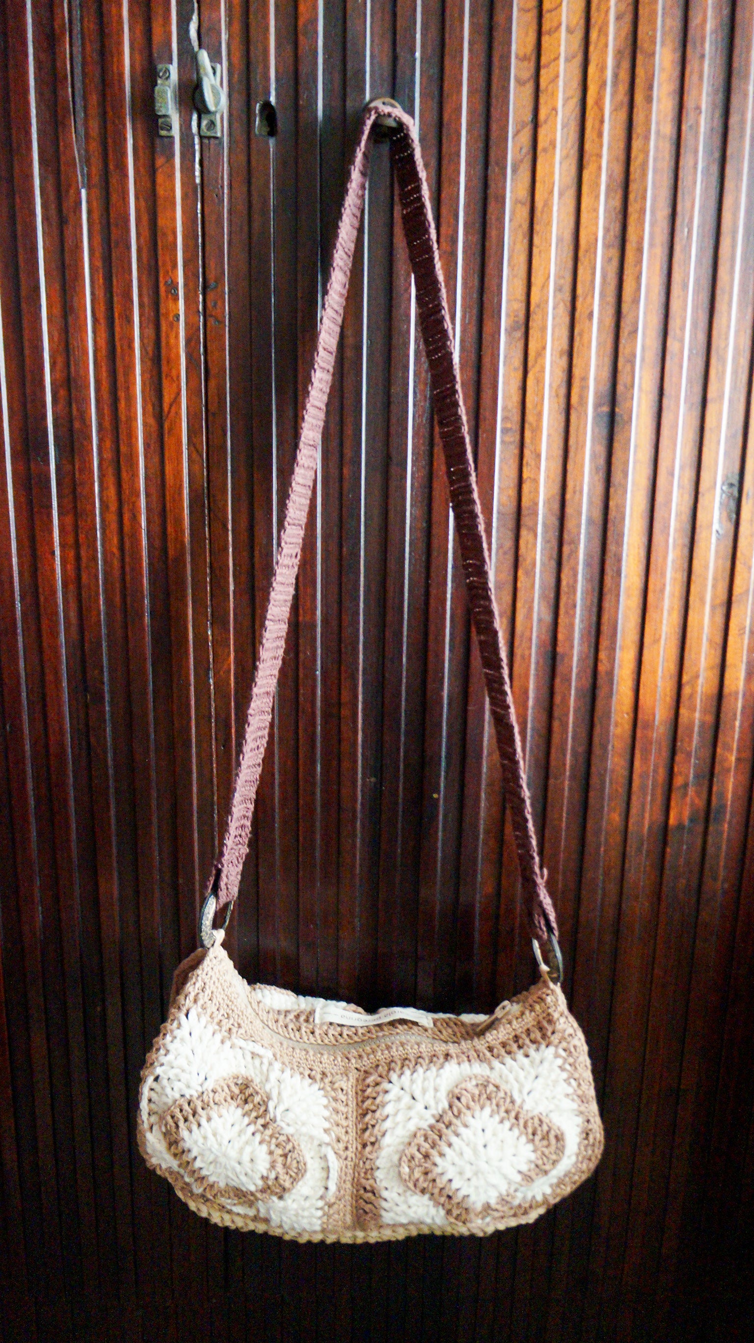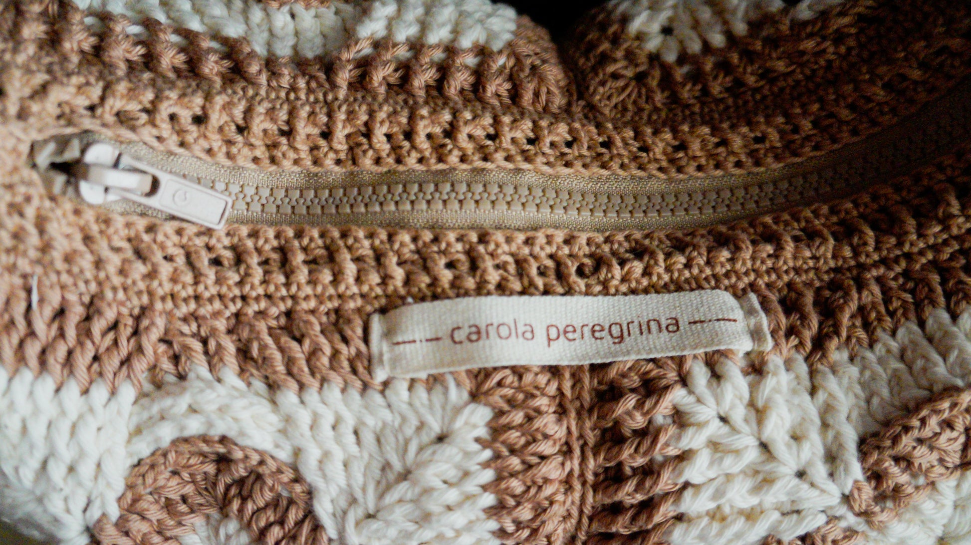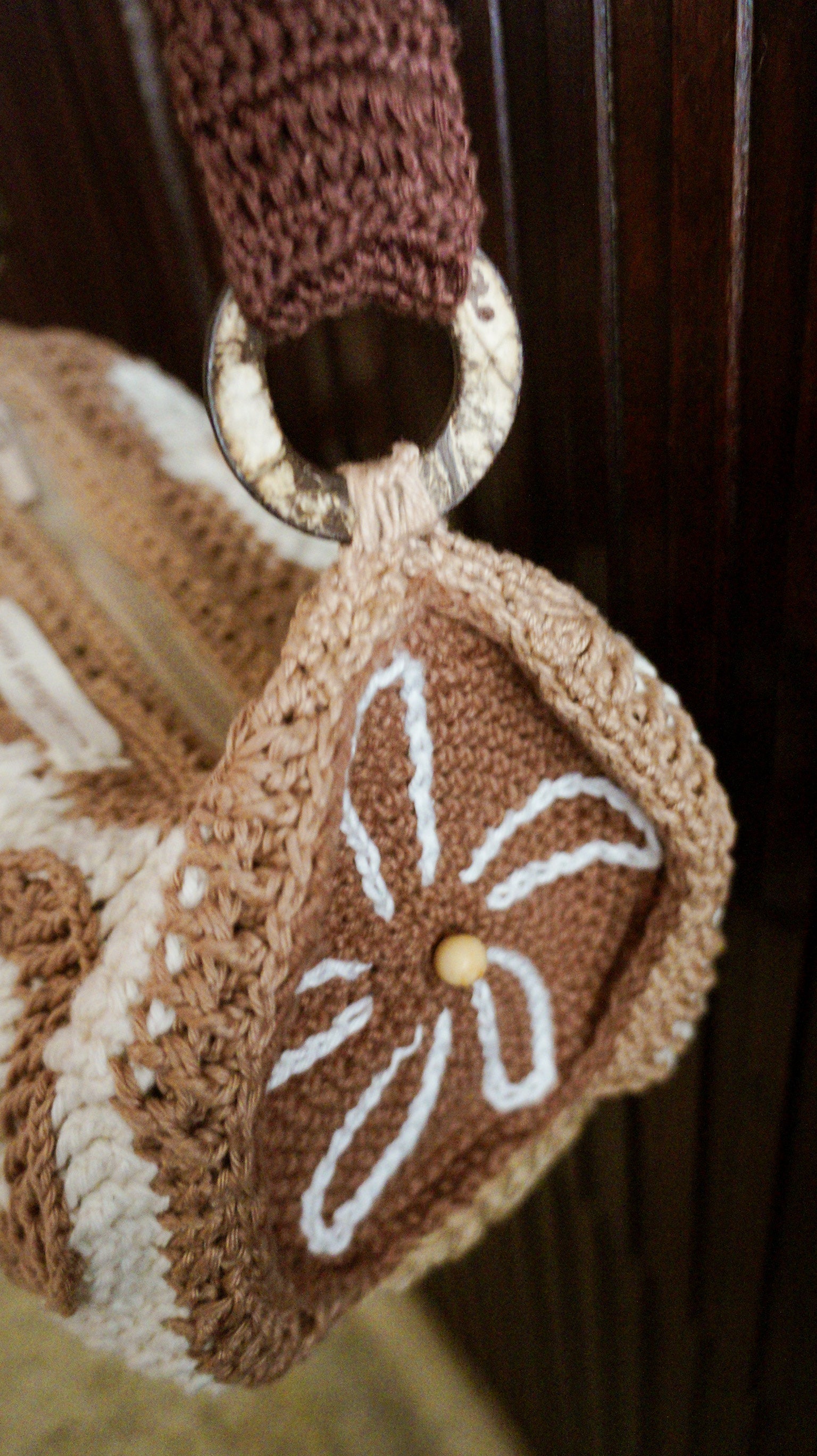 Bolsa em crochê com linhas 100% algodão, fechamento em zíper tratorado e detalhes com peças de côco, sementes de açaí e flor bordada em crochê pela artesã Lídia Marques