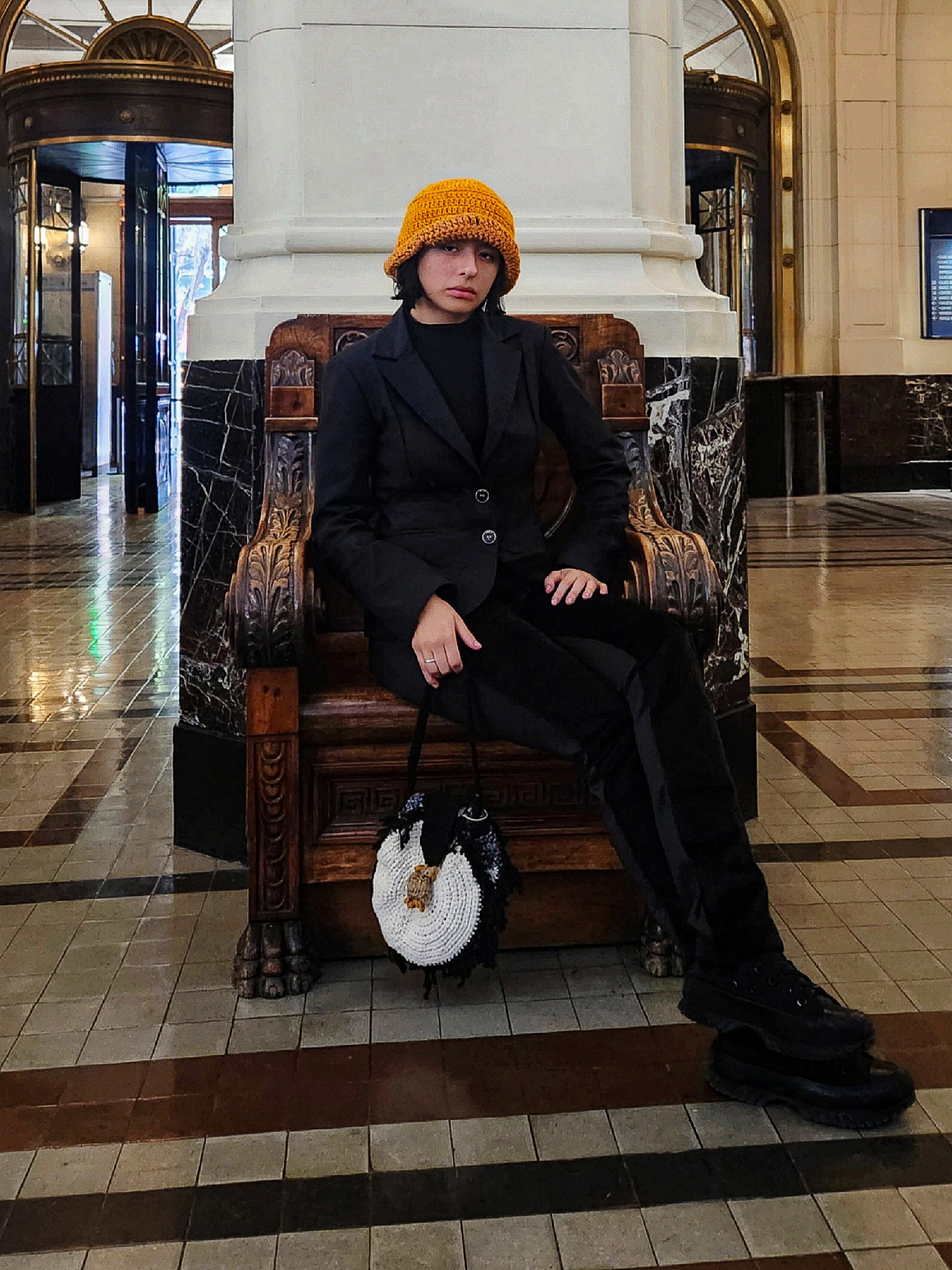 Bolsa redonda em crochê com fio de algodão com um leve brilho e detalhes do fechamento da aba em peça de madeira envolvida em crochê com juta e algodão egípcio