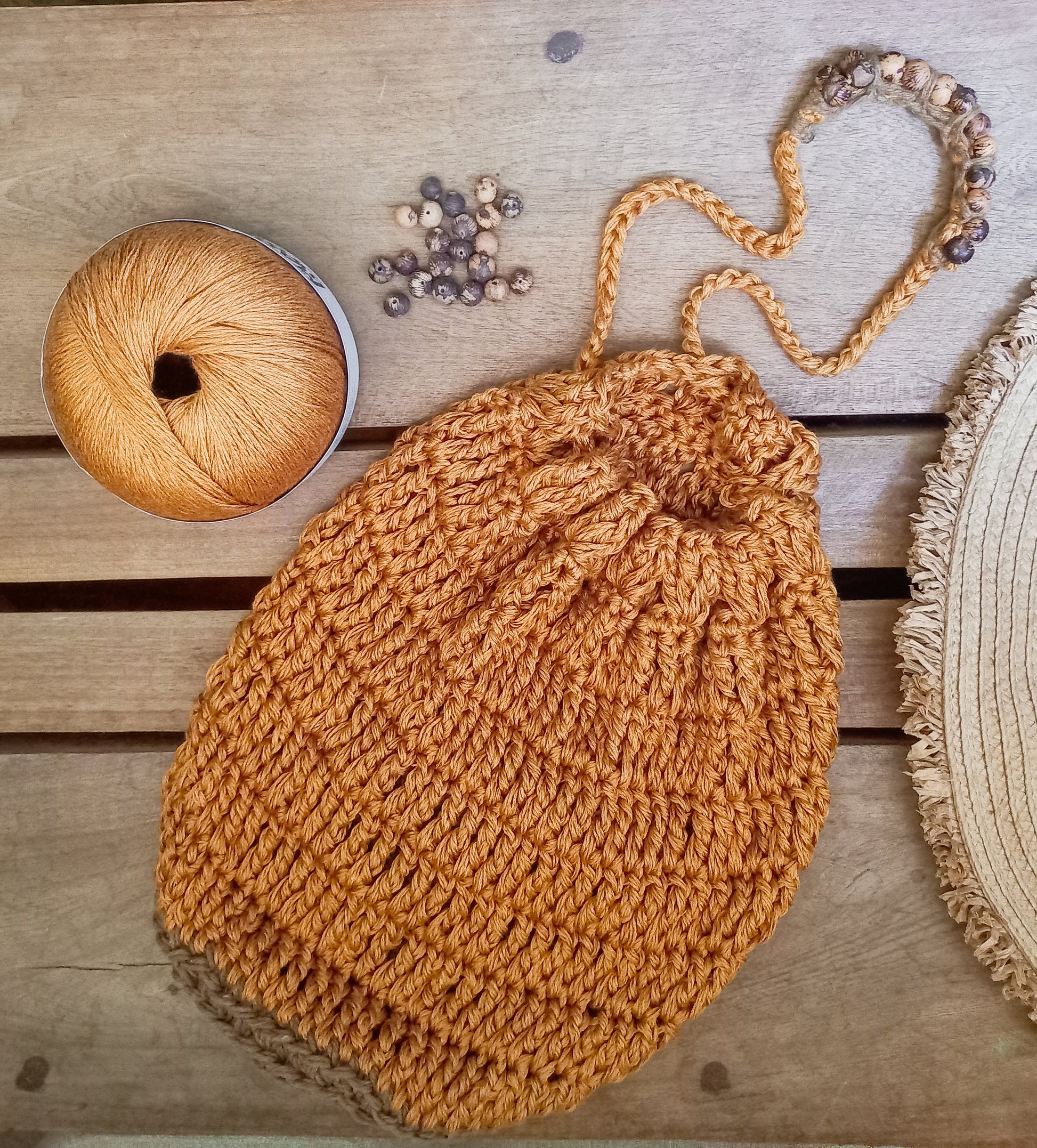 Bolsa de crochê em viscose de cana de açúcar e algodão reciclado com detalhes em sementes de açaí