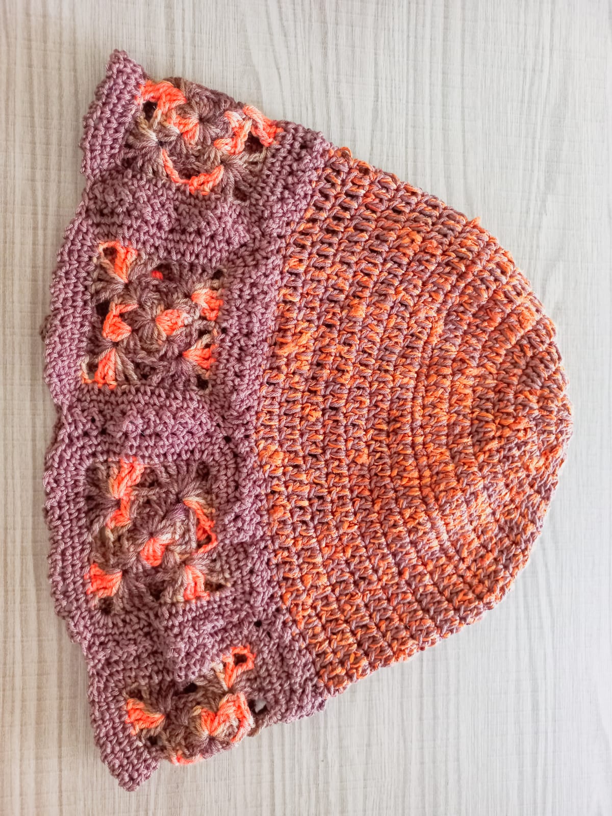 Chapéu de crochê em mescla de fios 100% algodão, seda orgânica com tingimento botânico e lã tingida manualmente nos detalhes dos Squares de crochê
