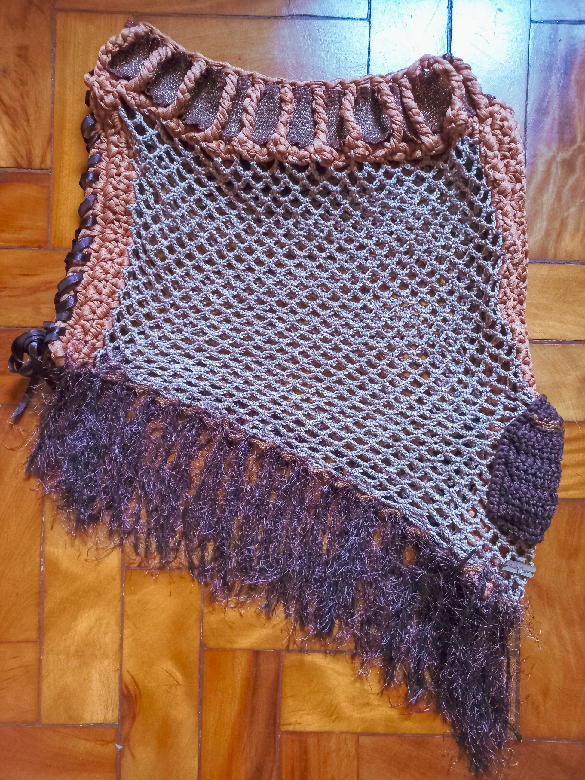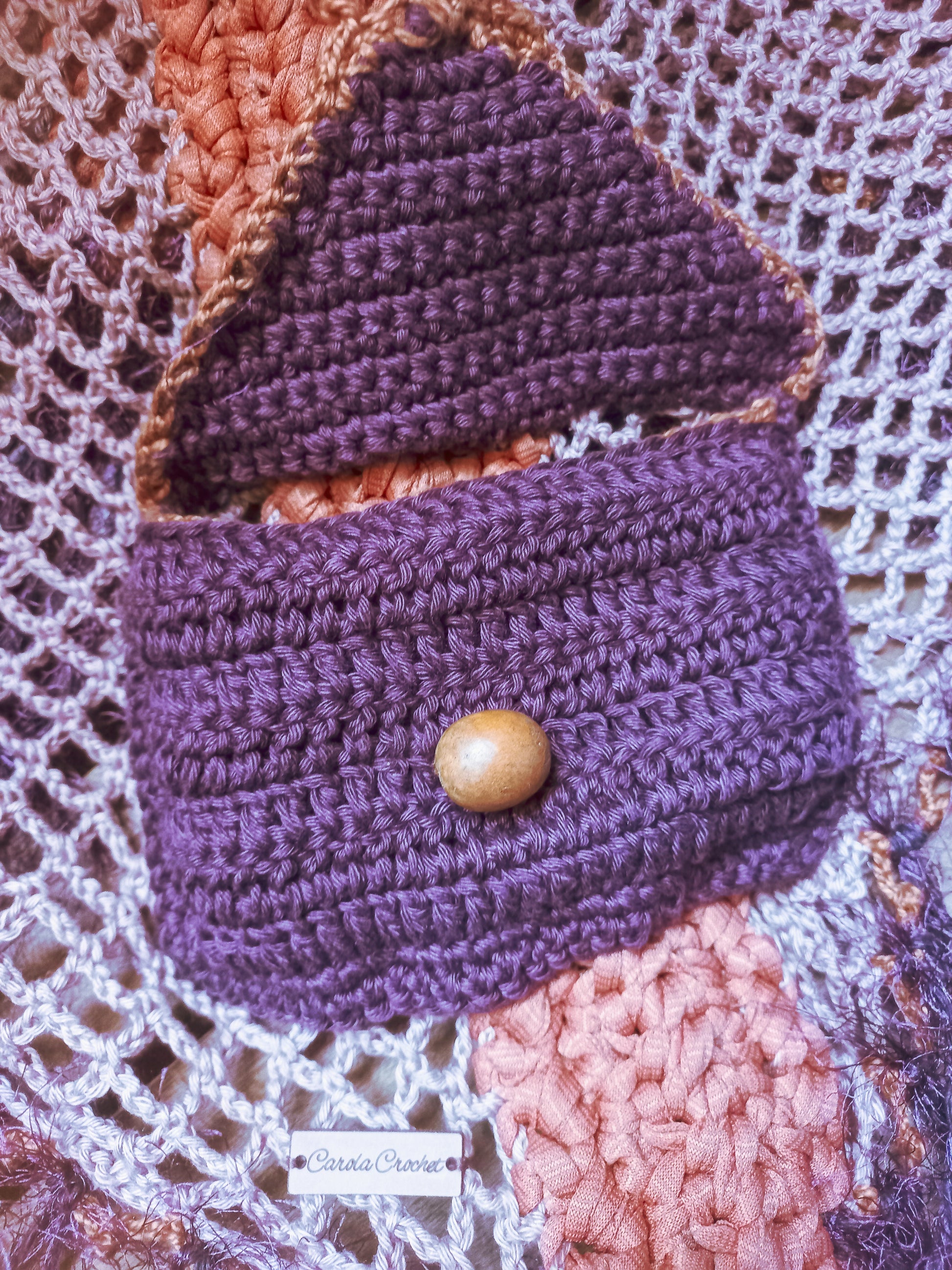 Saia em crochê com fio de malha e linhas 100% algodão, com bolso e peça de madeira upcycle