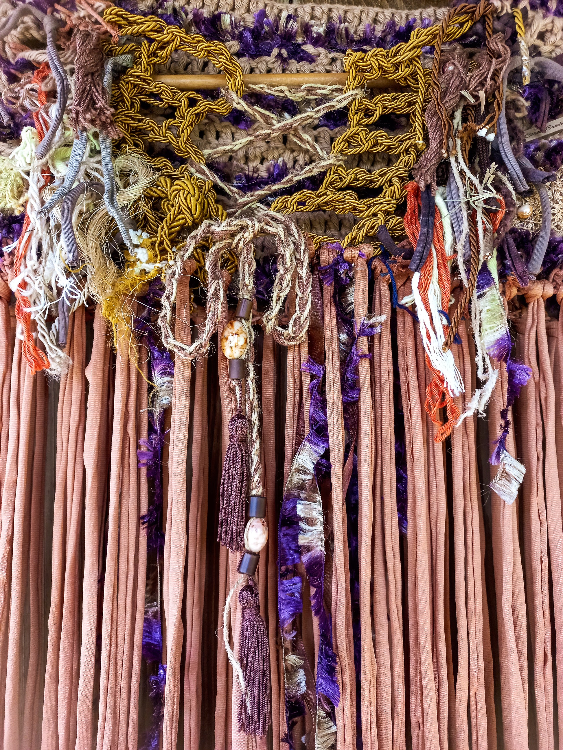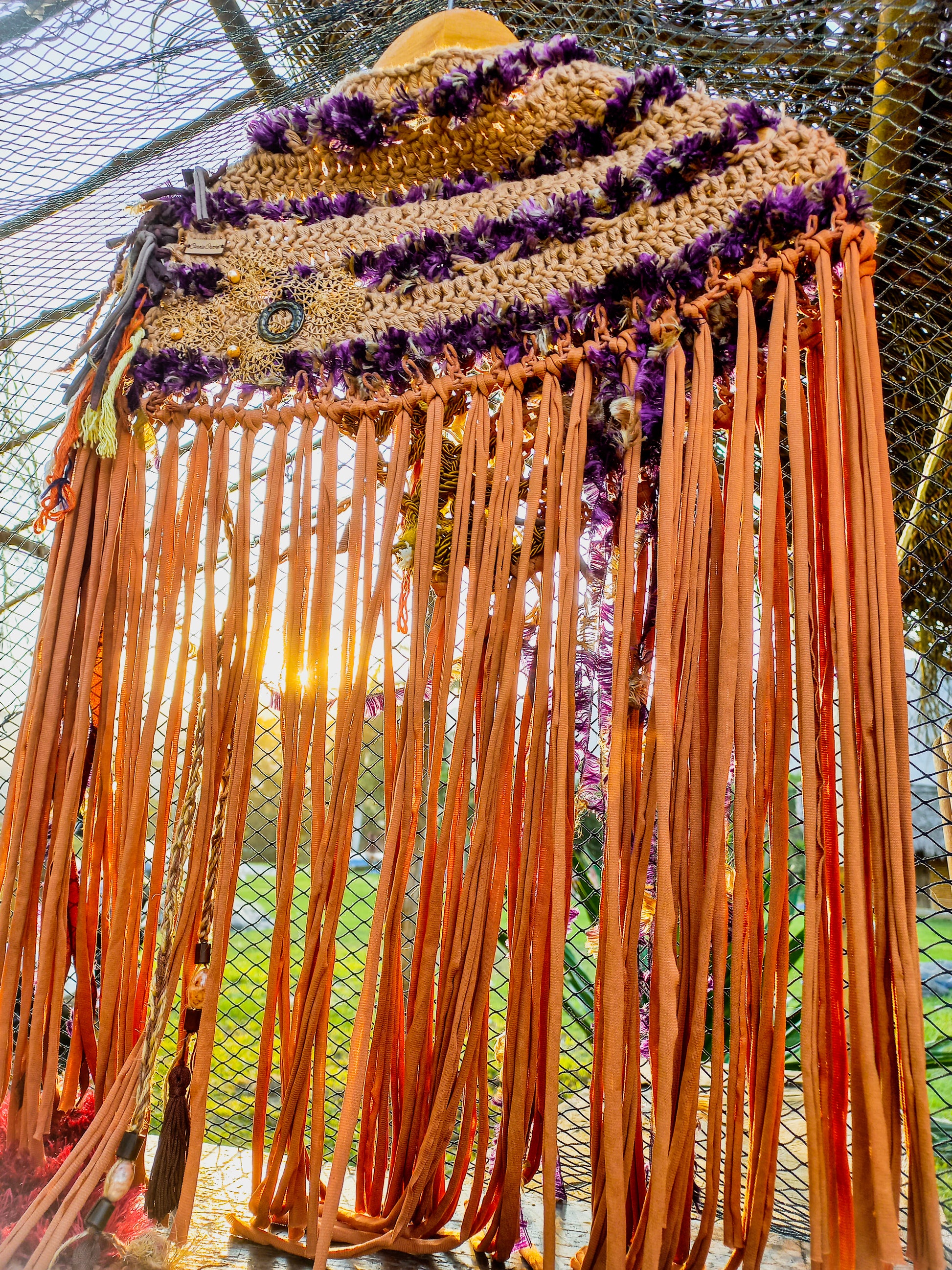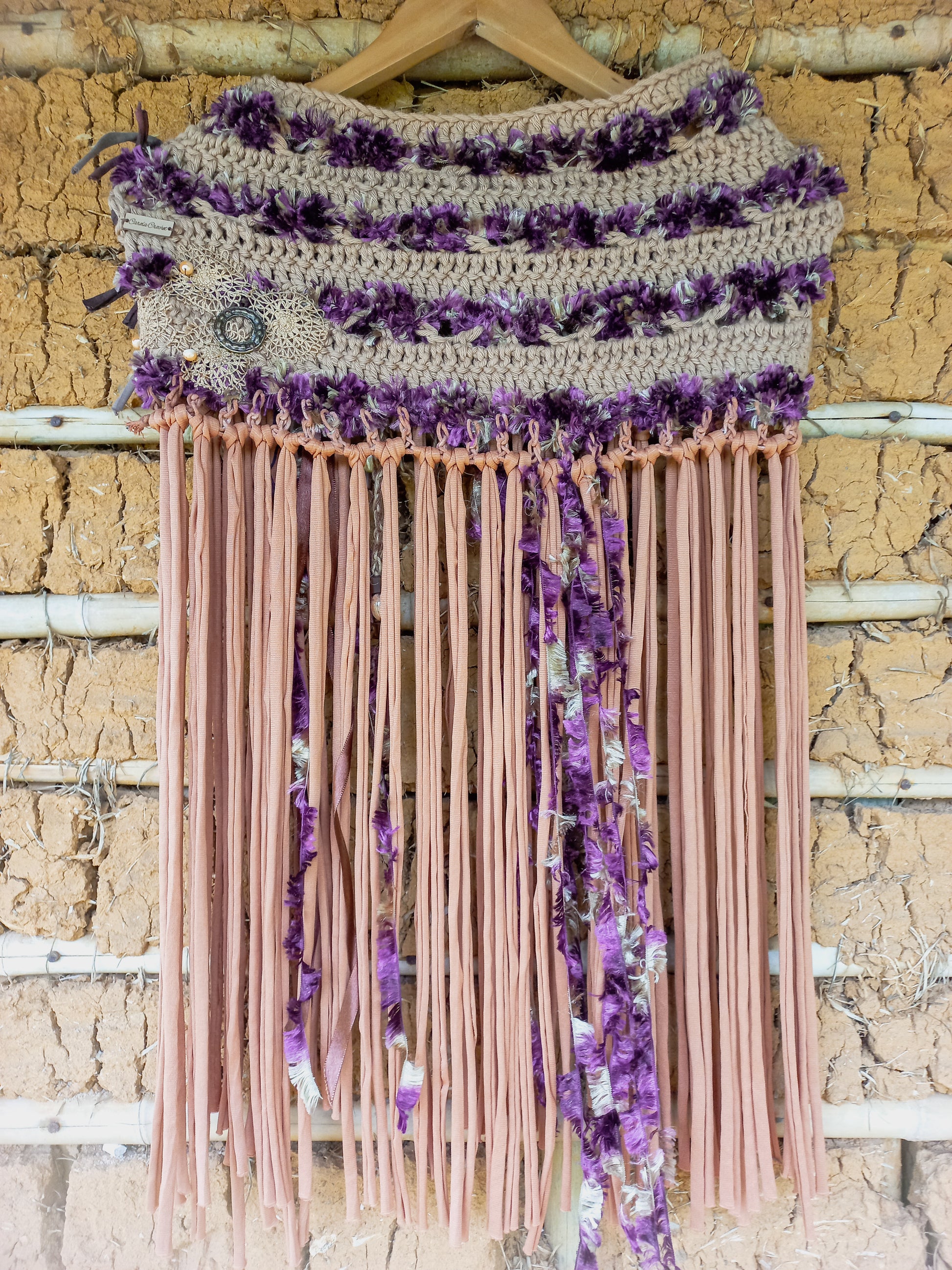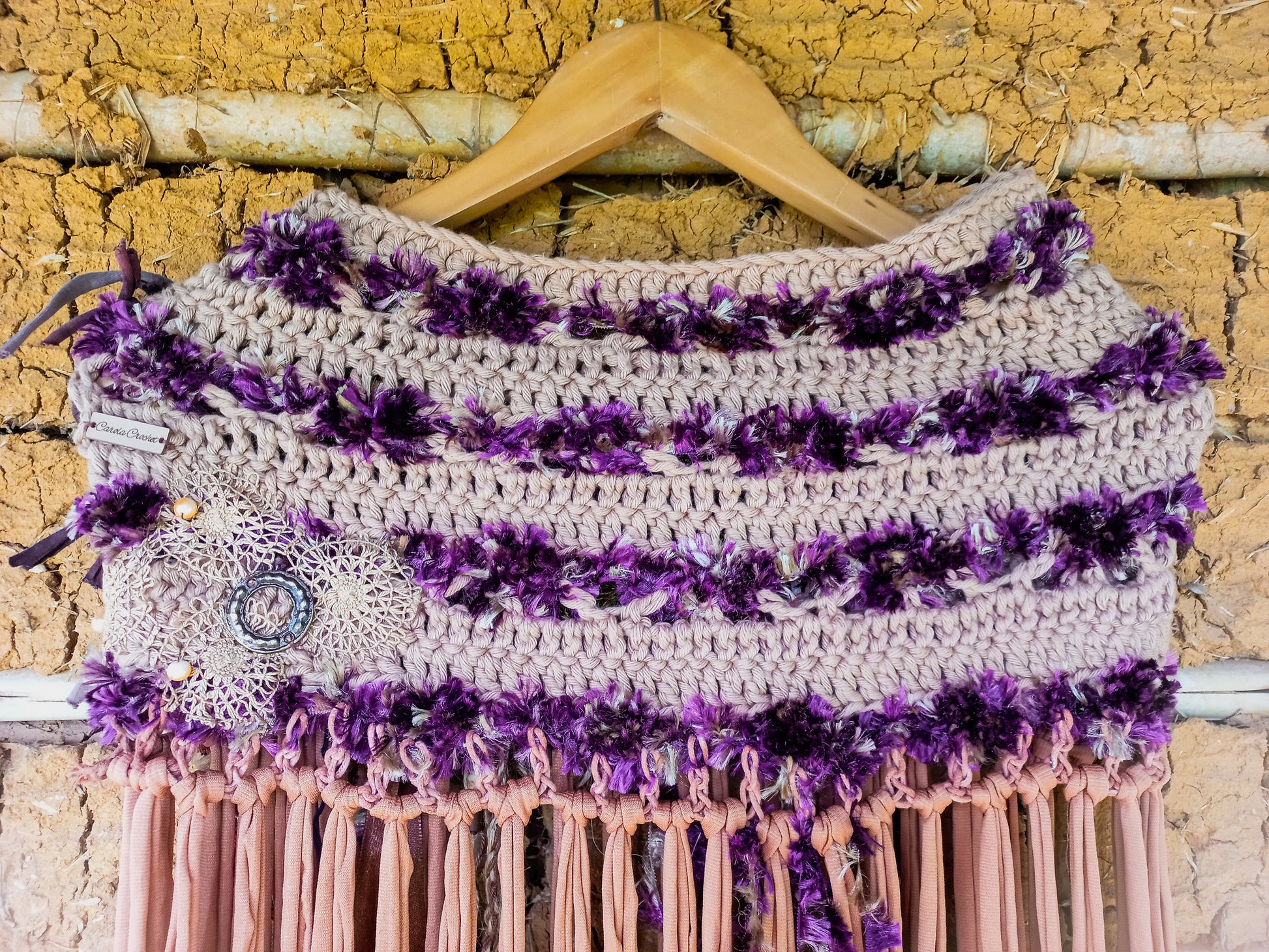 Saia de crochê em algodão com vários restinhos de linhas e amarração no quadril