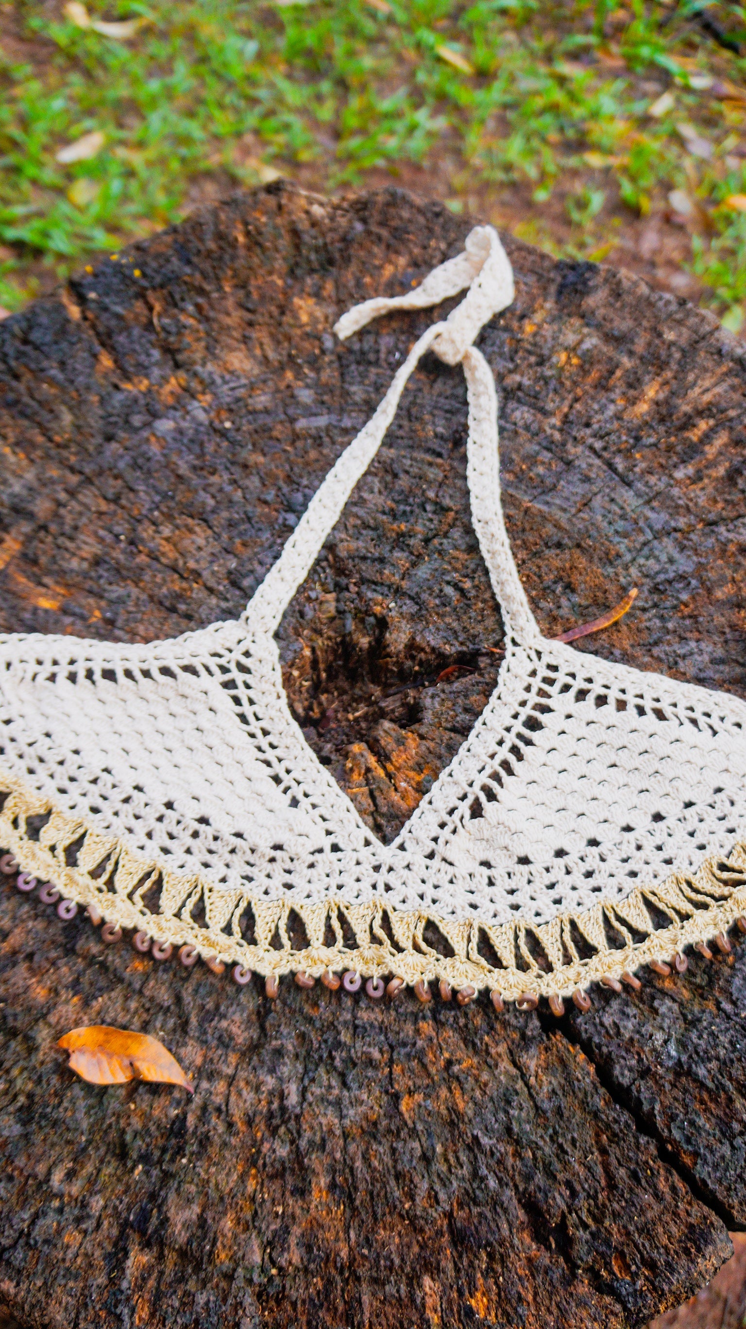 Top de crochê com linha 100%, detalhes em viscose e peças de madeira